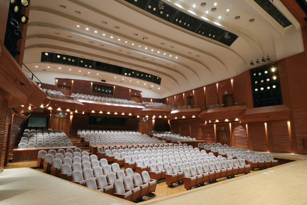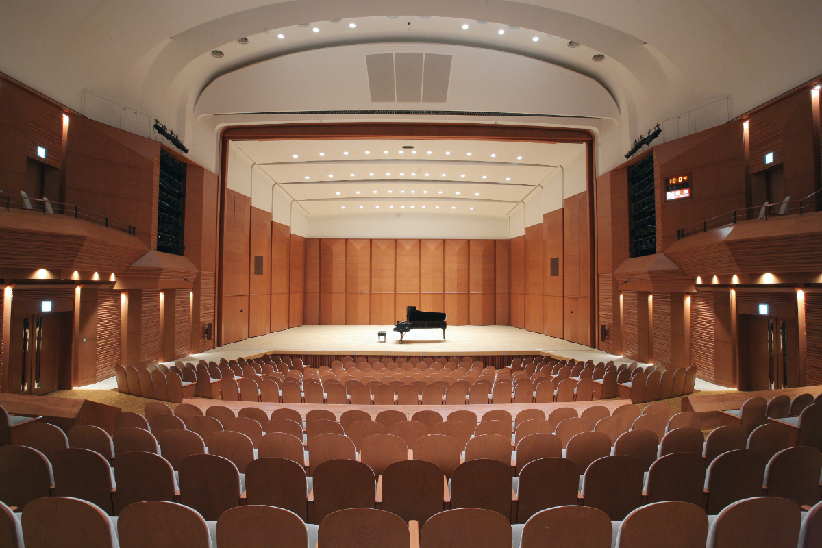 木を基調に設計された落ち着きのある空間。舞台は左右の袖を含めてゆとりある広さをもち、客席は中規模ホールならではのすぐれた音響効果をもたらします。