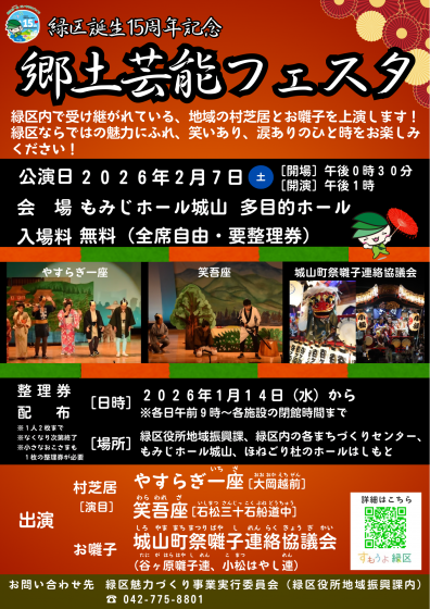 ※小さなお子様もお一人1枚の整理券が必要です緑区魅力づくり事業実行委員会(緑区役所地域振興課内) TEL:042-775-8801